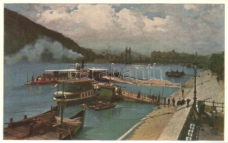 Budapest, Erzsébet híd, rakpart, gőzhajók. Művészlevelezőlap Hausner H...