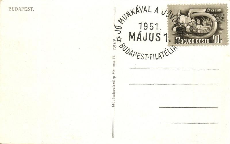 Budapest, Erzsébet híd, rakpart, gőzhajók. Művészlevelezőlap Hausner H. 7014/9. + 1951 Május 1. Jó Munkával a Jövőért Budapest Filatélia