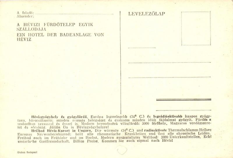 Hévíz, a fürdőtelep egyik szállodája, hátoldalon reklám (EK)