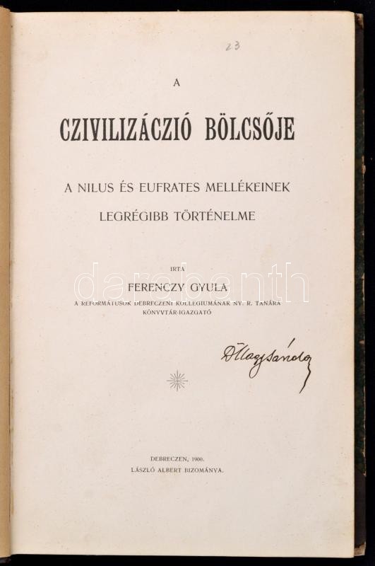 Ferenczy Gyula: A czivilizáció bölcsője. A Nílus és Eufrátesz mellékeinek legrégibb története. Debrecen, 1900, László Albert,(Csokonai-ny.), 199 p. Későbbi félvászon-kötés, kissé sérült gerinccel, kissé kopott borítóval, tulajdonosi névbélyegzővel, és névbejegyzéssel.