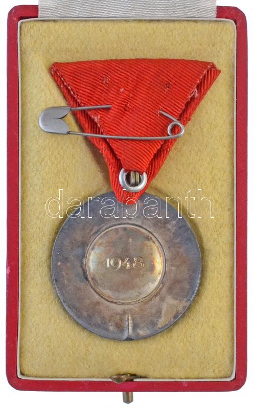 Description: 1948. "A Magyar Munka Érdemrend ezüst fokozata" ezüstözött és zománcozott Br kitüntetés sérült mellszalagon, hátoldalán "1948" évszámmal, eredeti dísztokban T:2 RR! /