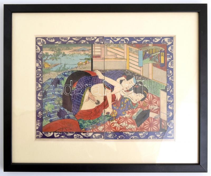Description: cca 1840 Utagawa iskola Shunga erotikus japán fametszet 19x24 cm üvegezett keretben / ca 1840 Japan, Utagawa school. Erotic Shunga wood plate engraving. 19x24 cm In glazed frame