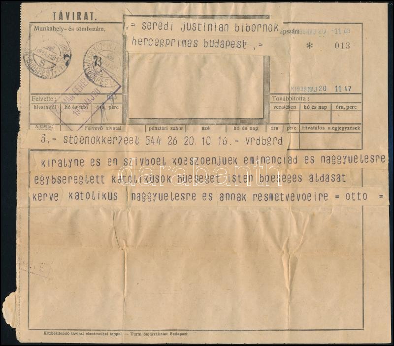 1939 Habsburg Ottó (1912-2011) trónörökös üdvözlő távirata Serédi Jusztinián bíborosnak a katolikus nagygyűlés alkalmából
