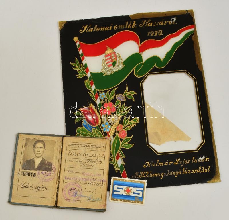 Description: 1939 Katonai emlék Kassáról, festett üveglap fénykép nélkül, szélein ragasztott papírral, festék kopásokkal, Kalmár Lajos későbbi 1950-es katonaigazolványával
