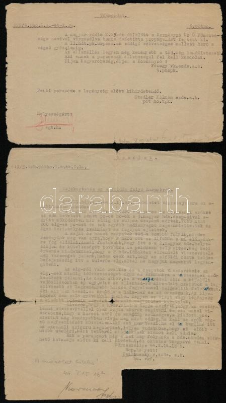 Description: 1944-1945 Szalatnay József (1915-1994) festő, tartalékos hadnagy 1945-ös igazoló nyilatkozata és hozzá kapcsolódó, a Horthy-féle kiugrási kísérletet cáfoló katonai parancs