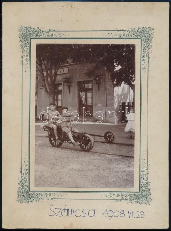 1908 Szárcsa, hajtány a vasútállomáson gyerekekkel, fotó, kartonra rag...