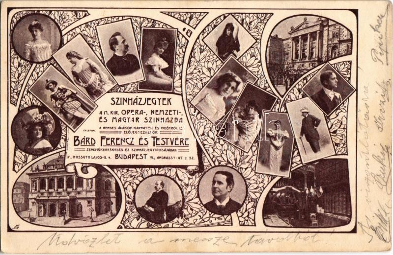 Description: Bárd Ferencz és Testvére Zenemű kereskedés és Színházjegy iroda reklámlapja. Színészek és színésznők, Opera, Magyar Színház; Budapest, Kossuth Lajos utca 4 és Andrássy út 2. / Hungarian Music shop and Theater Ticket Office advertisement card. Art Nouveau (EK)