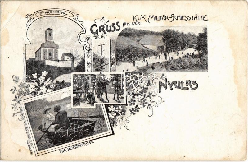 1915 Nyulas, Geoys, Jois; templom, cs. és kir. katonai lőtér, Csónakázás a Fertő tavon / Pfarrkirche, K.u.K. Militär Schiesstätte, Am Neusiedler See / church, K.u.k. military shooting range, Lake Neusiedl. J. Horváth floral, Art Nouveau (EK)