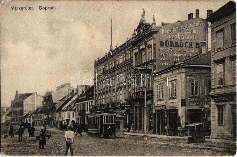 1911 Sopron, Várkerület, villamos, Dürböck szobafestő reklámja a házfa...