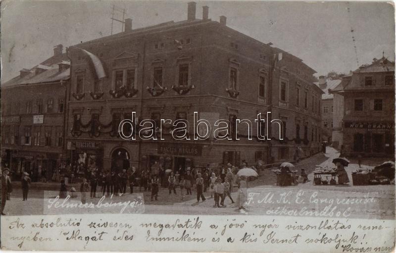 1902 Selmecbánya, Schemnitz, Banská Stiavnica; F.M.K.E. (Felvidéki Magyar Közművelődési Egyesület) Kongresszusa alkalmából feldíszített épület magyar zászlókkal. Deák Ferenc utca, Hitelintézet, Matula Antal, Herzog M., Wankovits Lajos utóda Takáts Miklós üzlete, Húscsarnok, piaci árusok / square view with shops and butchery, market vendors. Decorated building with Hungarian flags for the Congress of the Hungarian Cultural Association of Upper-Hungary. photo (EK)