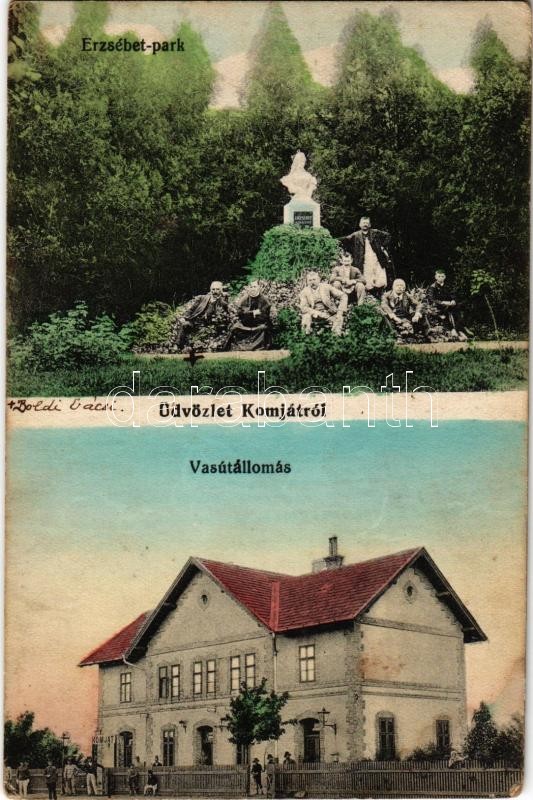 1915 Komját, Komjatice; Erzsébet park és szobor főurakkal és pappal, vasútállomás / Bahnhof / railway station, Sisi statue