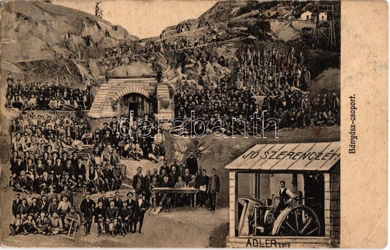 1910 Petrozsény, Petrosani; Jó szerencsét! Bányász csoport a Keleti-altárónál. Adler fényirda 2017. / Viel Glück! miners group picture