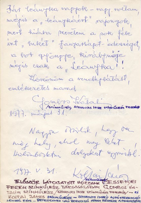 1977 Gombos Katalin színművésznő írása, aláírása+Koltai János színművé...