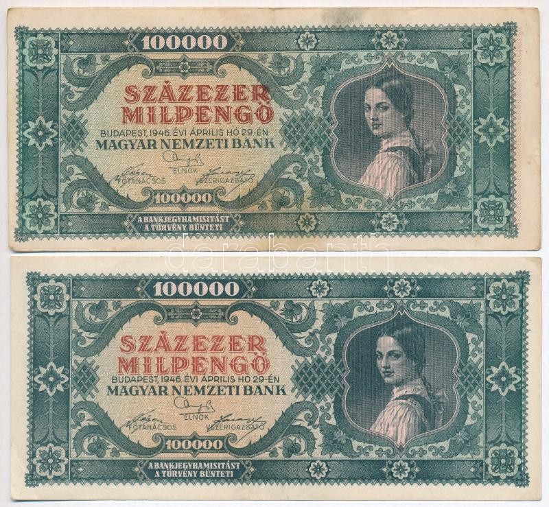 1946. 100.000MP (2x) egyiken a piros névérték erősen jobbra tolódva T:...