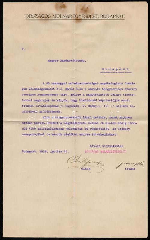 1918 Az Országos Molnáregyesület gépelt levele a Magyar Gazdaszövetség részére közelgő kongresszusuk tárgyában, aláírásokkal, melléklet nélkül