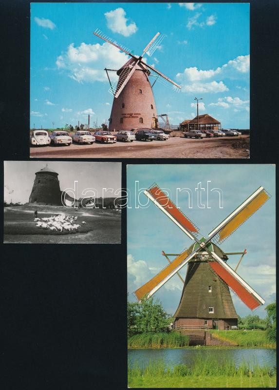 1936 Hékédi szélmalom, feliratozott vintage fotó Kerny István (1879-1963) hagyatékából, 5,5x8 cm + hozzáadva 2 db külföldi modern képeslapot szélmalom motívummal / windmill, 1 photo + 2 postcards