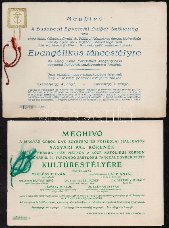 Description: 1932-1934 2 db kultúr- ill. táncestélyi meghívó: Magyar Görög Katolikus Egyetemi és Főiskolai Hallgatók Vasvári Pál Köre, Budapesti Egyetemi Luther Szövetség