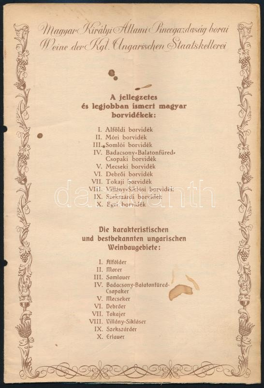 cca 1930 Magyar Kir. Állami Pincegazdaság borai. Több ceruzás bejegyzé...
