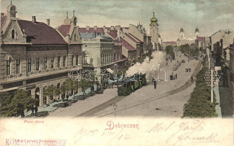 Debrecen, Piac utca városi vasúttal, Rogner szálloda, Karancsy Zs. üzl...