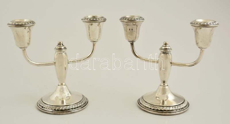 Ezüst (Ag.) kétágú gyertyatartó párban ( 2db), súlyozott, jelzett, m:14,5 cm (2×), bruttó: 842 g (együtt)