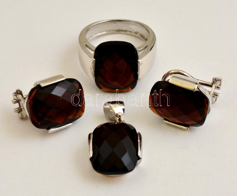 Ezüst(Ag) barna köves szett (gyűrű+fülbevalópár+függő), jelzett, méret...