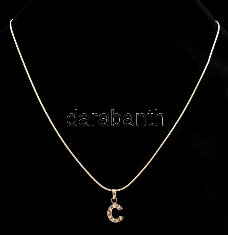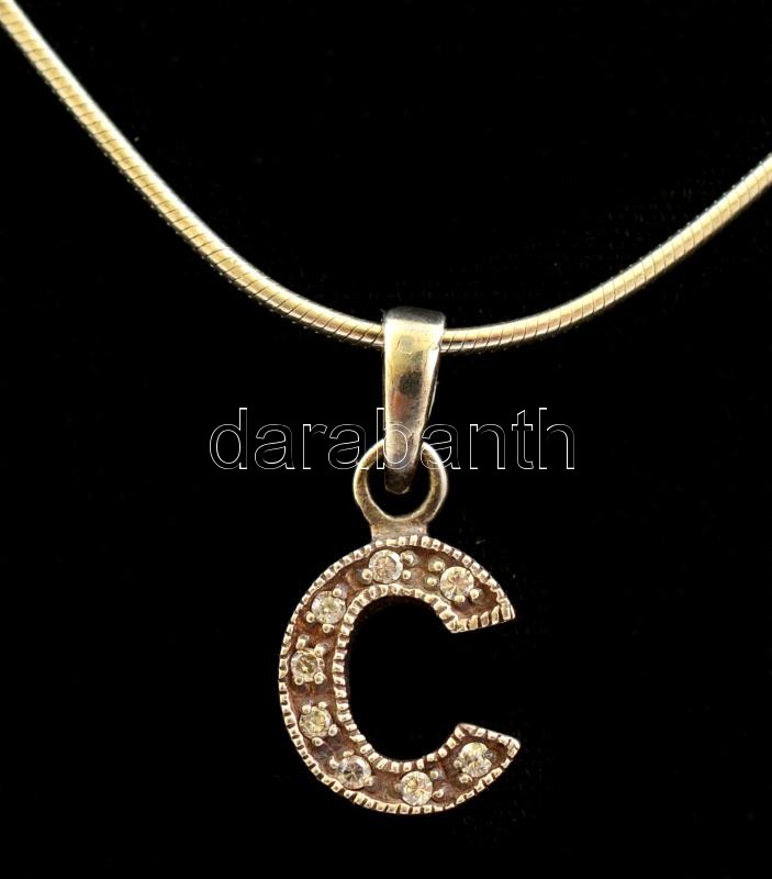 Ezüst(Ag) kígyó nyaklánc + "C" alakú apró kövekkel díszített függővel, h: 40,5 cm, bruttó. 4,6 g