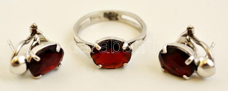 Ezüst(Ag) ovális köves bordó szett, fülbevalópár + gyűrű, méret: 55, jelzett, bruttó: 5,4 g