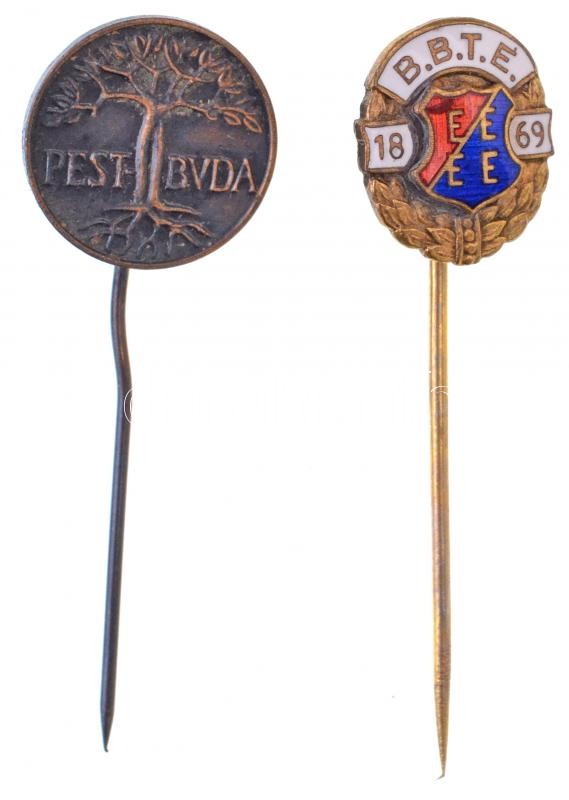 ~1930. "BBTE (Budapesti Budai Torna Egylet) 1869" zománcozott kitűző "BERÁN N. BPEST" gyártói jelzéssel (14,5x12mm) + DN "Pest-Buda / Állami Pénzverő, Budapest" Br kitűző (15mm) T:2