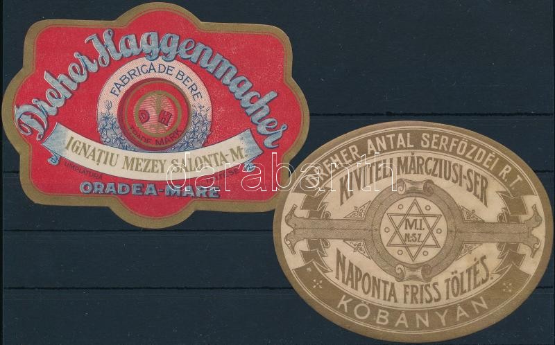 2 db Dreher sörcímke: Dreher Haggenmacher Nagyvárad, Mezey Ignác töltése, Nagyszalonta, Dreher Antal serfőzdéi Rt. Kőbánya