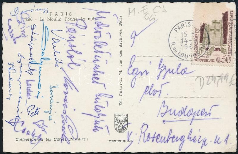 1963 1963 Újpesti Dózsa labdarúgó csapat (Solymosi, Káposzta, Gelei, stb.) aláírása Párizsból, Egri Gyula MTS elnöknek címzett képeslapon