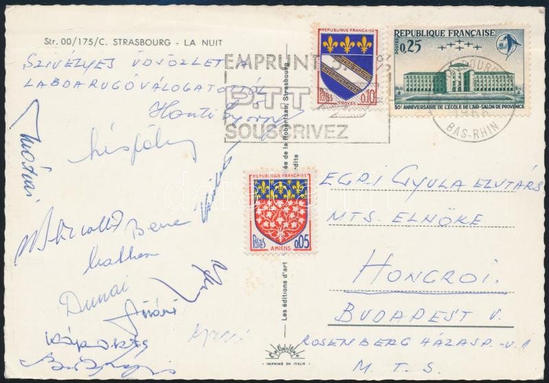 Description: 1966 Válogatott labdarúgó csapat (Bene, Dunai, Káposzta, Honti György MLSZ főtitkár, stb.) aláírása Strasbourgból, Egri Gyula MTS elnöknek címzett képeslapon