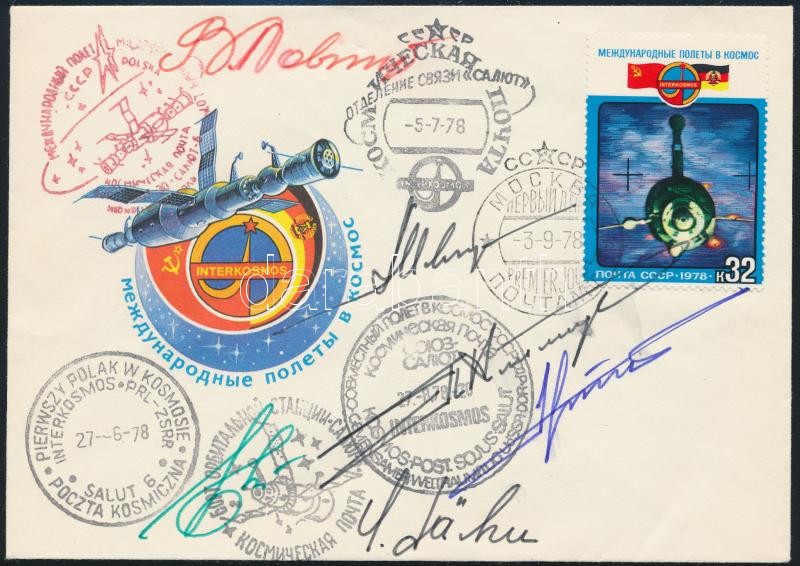 Valerij Bikovszkij (1934- ), Pjotr Iljics Klimuk (1942- ), Vlagyimir Kovaljonok (1942- ), Alekszandr Ivancsenkov (1940- ) szovjet, Sigmund Jähn (1937- ) német és Mirosław Hermaszewski (1941- ) lengyel űrhajósok aláírásai emlékborítékon /