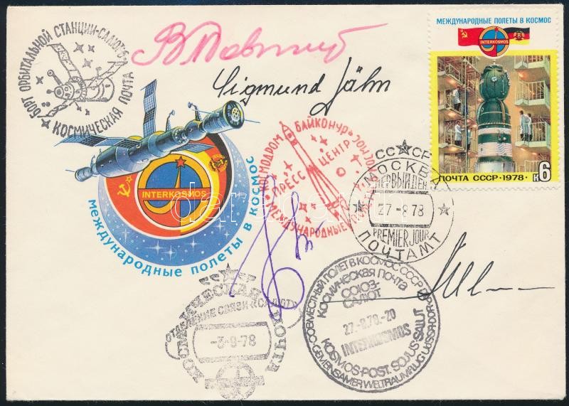 Valerij Bikovszkij (1934- ), Pjotr Iljics Klimuk (1942- ), Vlagyimir Kovaljonok (1942- ) szovjet és Sigmund Jähn (1937- ) német űrhajósok aláírásai emlékborítékon /