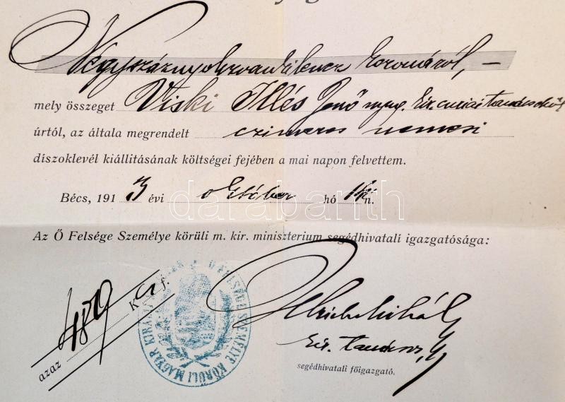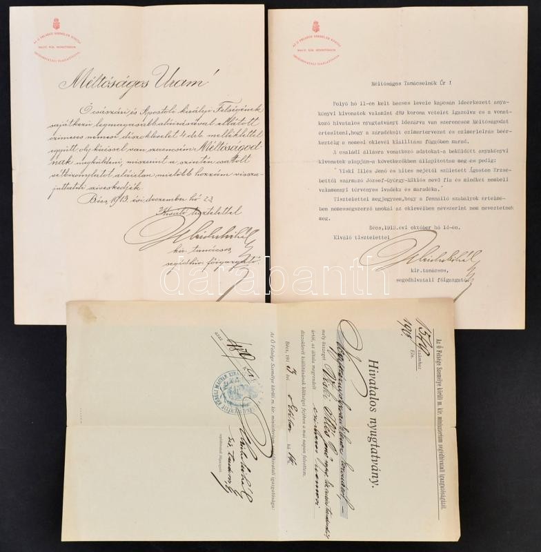 1913 Őfelsége Személye Körüli Magyar Királyi Minisztérium Segédhivatali Igazgatóságának 3 irata, (két levél, egy nyugta), fejléces papíron, pecséttel, Ulrich Mihály segédhivatali főigazgató aláírásaival, Viski Illés Jenő (1844-1917) jogász, kúriai tanácselnök, huszti járásbíró nemességszerző oklevélének ügyében íródott iratok.