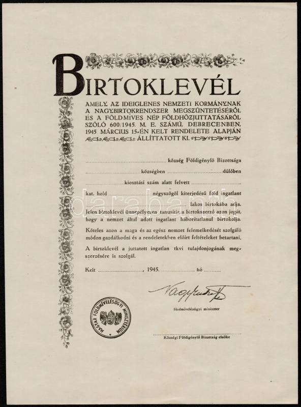 https://www.darabanth.com/en/311-Online-auction/311.0/Other-collectibles/Documents~300016/1945-Az-Ideiglenes-Nemzeti-Kormany-nagybirtokrendszer-megszunteteserol-szolo-rendelete-alapjC3~II1695348