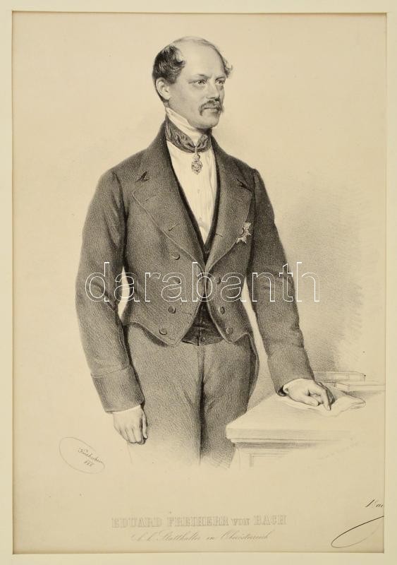 cca 1855 Josef Kriehuber (1800-1876): Eduard von Bach (1815-1884) osztrák politikus, Alexander Bach (1813-1893) testvére, L. T. Neumann bécsi műhelyében készült, litográfia, paszpartuban, tintás bejegyzéssel, szakadással, javított, 41x29,5 cm.