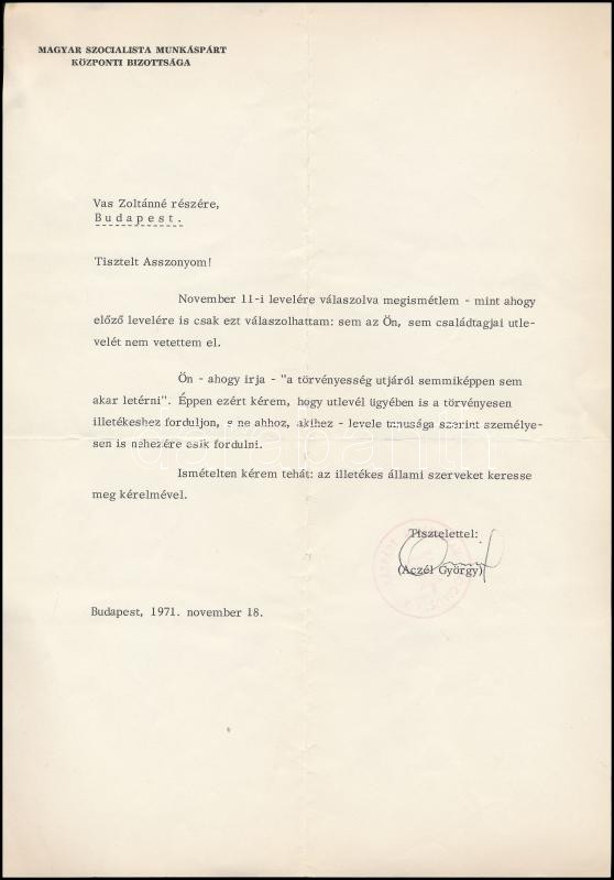 1971 Aczél György (1917-1991) saját kézzel aláírt levele Vas Zoltán (1... https://www.darabanth.com/en/311-Online-auction/311.0/Other-collectibles/Historical-documents-manuscripts~300017/1971-Aczel-Gyorgy-1917-1991-sajat-kezzel-alairt-levele-Vas-Zoltan-1903-1983-iro-56-os-~II1674201