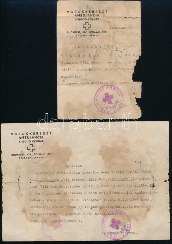 1944 Vöröskeresztes laboráns igazolványa és igazolása, munkaszolgálatos részére, az egyik fényképpel, pecsétekkel, aláírásokkal, rossz állapotban.