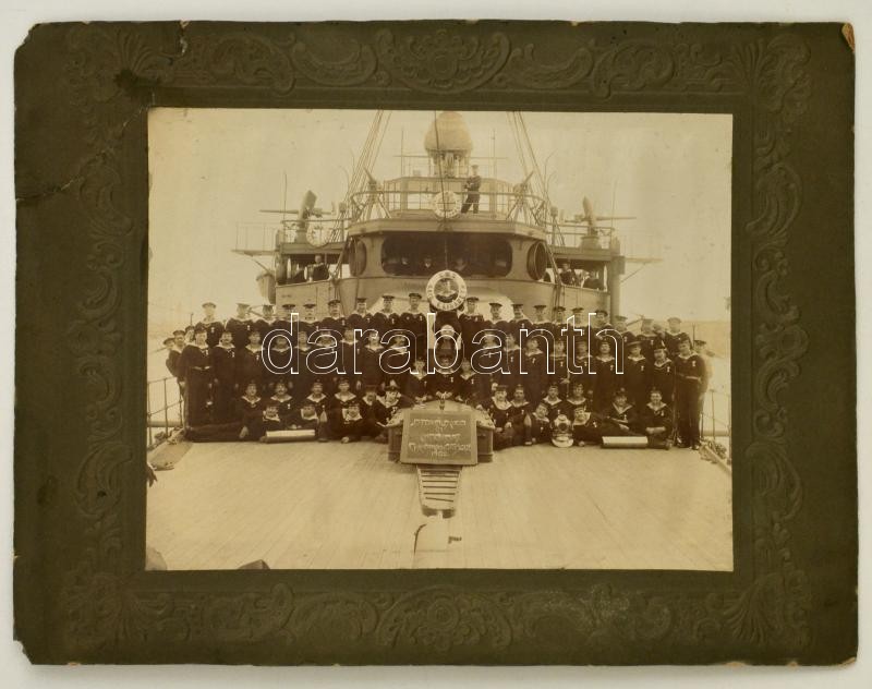 1908 Austro-Hungarian warship S.M.S. Kaiserin Elisabeth and its crew during its stay in China. The ship participated in the ending the Boxer uprising .The sign of the soldiers says in Hungarian: "God bless the Hungarians in China and at home" On embossed cartboard with corrected dog ear. 38x29 cm, Photo size: 27x21 cm