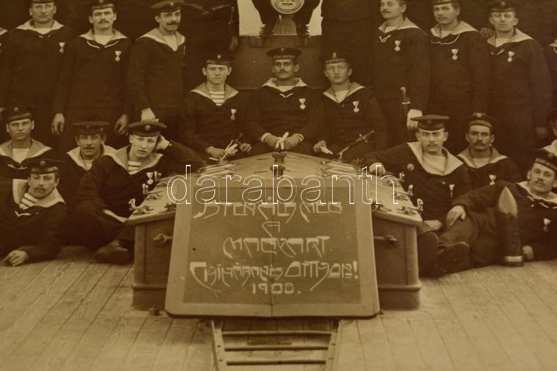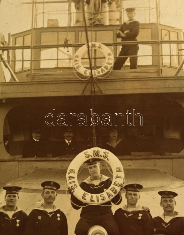 1908 Az S.M.S. Kaiserin Elisabeth osztrák-magyar csatahajó magyar legénységét ábrázoló ritka felvétel. A hajó Kínában állomáshajóként szolgált a boxer lázadás alatt. A tablóképen a katonák által tartott tábla felirata "Isten áldd meg a magyart Chinában ls otthon". Dombornyomott kartonon. A karton szélén javított hajtásnyom./