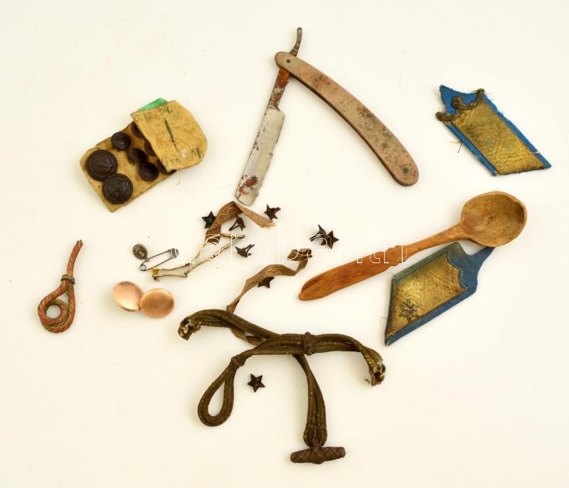 Katonai relikvia gyűjtemény: vállap, gomb, borotva, egyéb