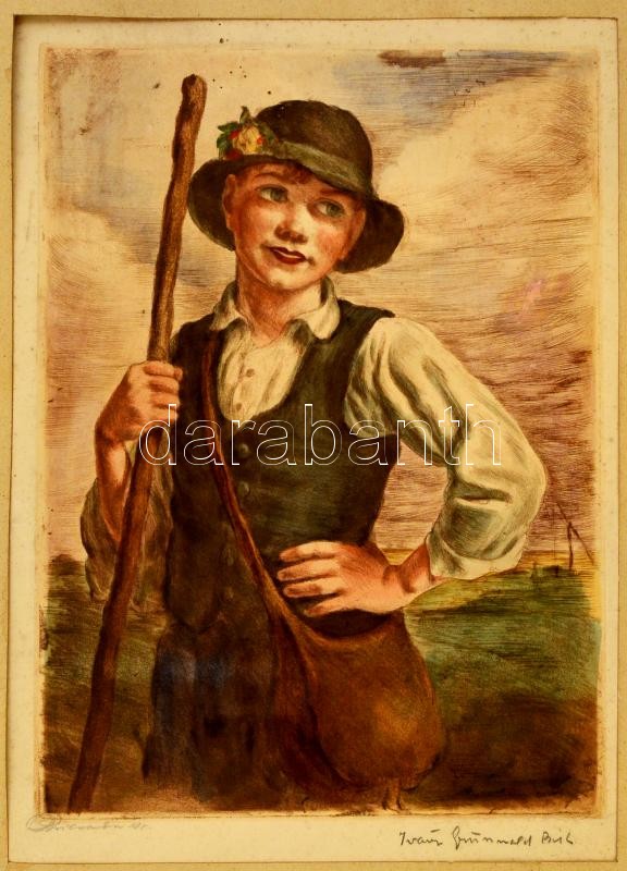 Prihoda István (1891-1956) - Iványi Grünwald Béla (1867-1940): Legény. Színezett rézkarc, papír, jelzett, 32×24 cm