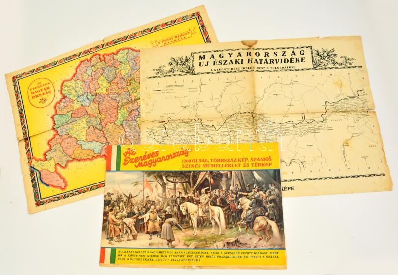 1938 2 db térkép és egy reklám nyomtatvány: Magyarország új északi határvidéke I-II. A Pesti HÃrlap térképe, kétoldalas, szakadásokkal, Az ezeréves Magyarország és Európa 1938 végén kétoldalas térkép, hajtásnál ragasztott és szakadt, Az ezeréves Magyarország könyv reklám nyomtatványa, különbözÅ‘ méretben