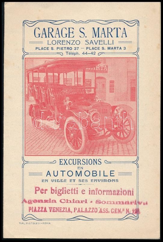 cca 1910-1920 Garage S. Marta Roma, automobil kirándulásokat szervező olasz cég prospektusa, Roma, Pistolesi-ny., olasz, francia, német és angol nyelveken, jó állapotban./ cca 1910-1920 Brochure of Garage S. Marta Rome, automobiles excursions, Rome, Pistolesi, in Italian, French, German and English languages, in good condition.