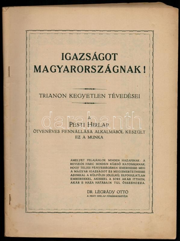 cca 1928 Igazságot Magyarországnak! Trianon kegyetlen tévedései, fősze... https://www.darabanth.com/en/311-Online-auction/311.0/Other-collectibles/Printed-Materials~300050/cca-1928-Igazsagot-Magyarorszagnak-Trianon-kegyetlen-tevedesei-foszerk-Legrady-Otto-a-P~II1699586