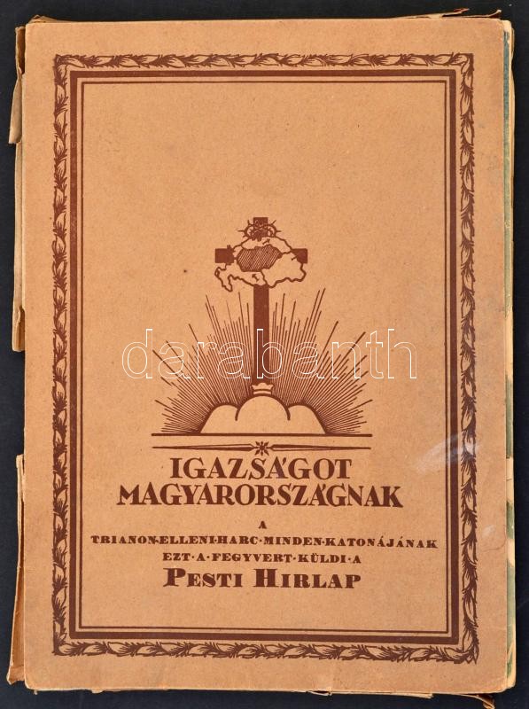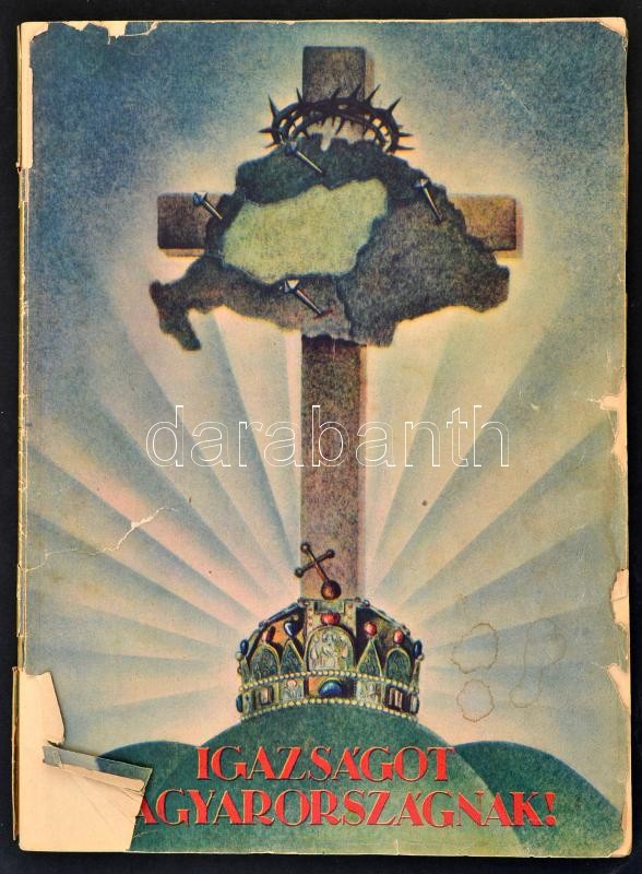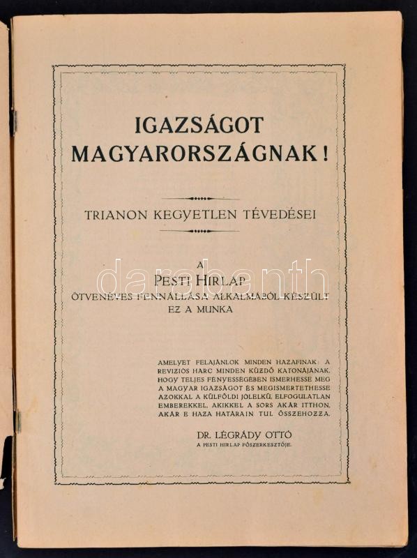 cca 1928 Igazságot Magyarországnak! Trianon kegyetlen tévedései, fÅ‘szerk.: Légrády Ottó, a Pesti HÃrlap melléklete, papÃrkötésben, papÃrtokban, megviselt állapotban, szakadozott borÃtóval, kijáró lappal, a papÃrtok sérült.