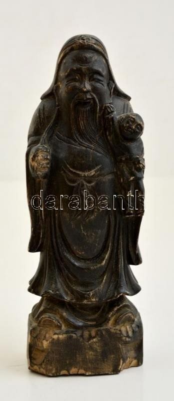 Kínai bölcs, fa szobor, repedéssel, kopásnyomokkal, m: 23,5 cm