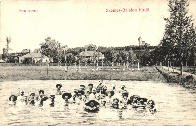 Balatonszemes, Parti részlet, fürdőzők, háttérben villa. Berliner Salamon kiadása (ragasztónyom / glue mark)