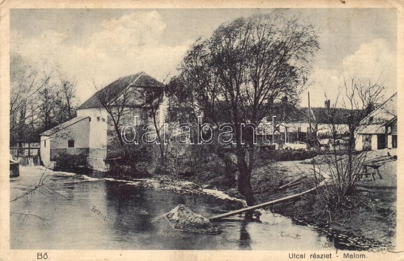 Bő, Malom, utcakép. Hangya fogyasztási szövetkezet kiadása (EK)