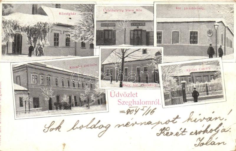 Description: Szeghalom, Községháza, Kir. Járásbíróság, Községi szálloda, Magy. kir. Posta, Kárász kastély télen, Stern Mór üzlete és saját kiadása (kis szakadás / small tear)